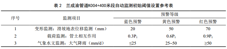 目前,已在蘭成渝管道、蘭成管道、蘭鄭長(cháng)管道干線(xiàn)和支線(xiàn)管道災害高風(fēng)險區域共布設17處預防性監測點(diǎn),每處監測點(diǎn)均包括管道應力應變監測、地表位移監測及降雨量監測等,初步形成甘肅區域管道地質(zhì)災害預防性監測預警網(wǎng)。監測到關(guān)注級預警20多次,成功消除各類(lèi)中、小型地質(zhì)災害隱患30多處,預先避免了管道地質(zhì)災害的惡化及發(fā)生。