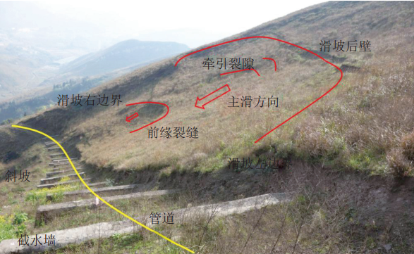某管道敷設于桐梓縣貓頭山區ZY074+500米斜坡變形處,經(jīng)勘探確認,管道上方斜坡發(fā)育為長(cháng)70 m、寬80 m、前后緣最大高差約25 m的淺表層土質(zhì)滑坡。不穩定斜坡平均坡度為24°,四周相對較高,地貌上為淺型凹地,具有較好的匯水條件。斜坡體表面堆積層覆蓋,結構松散,基巖結構面與斜坡坡面斜交。