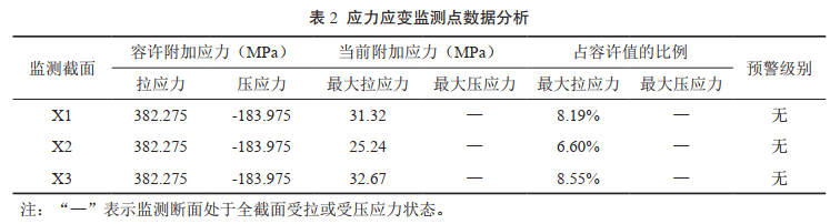 如圖 3所示,在管道外壁A(yíng)、B、C 3個(gè)監測點(diǎn)安裝應變計測量各點(diǎn)應變值,即可計算管道截面內任意點(diǎn)的應變值大小,由胡克定律,計算得到監測截面的最大應力值。據此可長(cháng)期監測管道截面實(shí)時(shí)應力大小及變化趨勢。按照QSY 1672―2014《管道滑坡災害監測規范》,將管道地質(zhì)災害風(fēng)險分為藍色、黃色、紅色三個(gè)等級預警,對應的管道附加應力達到管道拉(壓)應力允許值分別為30%、60%、90%。
