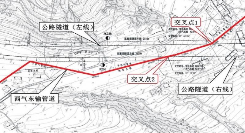 銀昆高速隧道規劃路由位于西氣東輸管道下方,相對位置關(guān)系見(jiàn)圖 1。管道設計壓力10 MPa,管徑1219 mm,壁厚18.4 mm,鋼管材質(zhì)L555,埋設于地表以下約2 m。隧道開(kāi)挖斷面大(掘進(jìn)直徑13.5 m,隧道頂部埋深約82 m),位于管道下部平均夾角約15°,有2處交叉點(diǎn)。