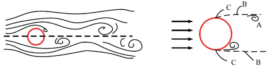 管道渦激振動(dòng)會(huì )導致深海中平管和立管發(fā)生響應振動(dòng)和疲勞破壞,從而增大管道失效概率,縮短管道使用壽命[3]。管道振動(dòng)出現在橫流方向上的可能性較大[4],一般認為順流方向的振動(dòng)不會(huì )引發(fā)嚴重的管道振動(dòng)問(wèn)題,圖 1表示渦流引起的振動(dòng)。