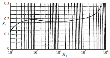 (1)基于St和Re函數關(guān)系,已知ue為0.75 m/s;Do為0.6604 m;海水的運動(dòng)黏度ν為9.3×10-7 m2/s,則: