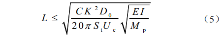 一般認為fs=(0.8~1.2)fp,海底懸空管將會(huì )出現渦激共振現象[6],由式(1)可知,已知海底懸空管段CD為定值,則St也為定值,Uc、Do為已知定值,所以fs就是定值。因此,避免發(fā)生渦激共振現象的主要措施是改變fp大小,從式(4)可以看出,改變fp最有效的方法是控制海底懸空管段的跨長(cháng),從而避免出現渦激共振現象。