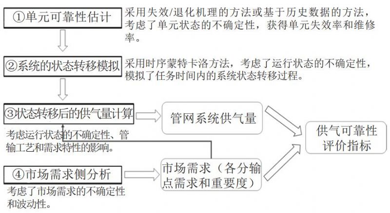 由此可知,盡管?chē)鴥韧鈱τ诠芫W(wǎng)系統可靠性已經(jīng)開(kāi)展了卓有成效的研究,但對于天然氣需求的波動(dòng)特征以及用戶(hù)重要度的影響還缺乏考慮;诖,本文提出考慮需求側影響的天然氣管網(wǎng)系統可靠性評價(jià)方法,實(shí)現了可靠性評價(jià)與管網(wǎng)水力計算和市場(chǎng)需求側分析的結合,彌補了傳統天然氣管網(wǎng)系統可靠性評價(jià)中缺乏考慮需求側影響的不足,其研究框架如圖 1所示。