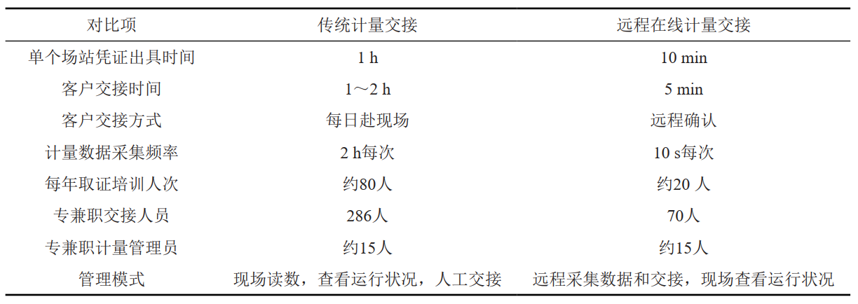 借助創(chuàng )建的動(dòng)力設備遠程診斷系統,通過(guò)長(cháng)期對壓縮機組、泵機組等的運行負荷、內部氣流溫度、壓力及轉速等數據分析,實(shí)現了機組性能衰減、熱端部件等效運行時(shí)間計算,為未來(lái)機組壽命監測、視情維修提供了技術(shù)支持。計量設備遠程診斷系統可對現場(chǎng)各類(lèi)流量計、流量計算機、溫變和壓變進(jìn)行遠程狀態(tài)指示、診斷,通過(guò)分析壓力流量等數據趨勢變化和報警信息,遠程在線(xiàn)實(shí)時(shí)監測關(guān)鍵計量設備的健康狀態(tài)。同時(shí),實(shí)現在線(xiàn)油氣計量交接,通過(guò)SCADA系統采集數據自動(dòng)生成交接憑證,啟用遠程電子簽章實(shí)現在線(xiàn)計量交接,減少了站場(chǎng)現場(chǎng)抄表、錄入及完成紙質(zhì)簽章等作業(yè),每個(gè)場(chǎng)站可減少計量人員4~6人,如表 1所示。