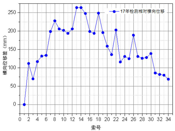 在結構定期檢測過(guò)程中發(fā)現主梁存在嚴重的橫向偏位,偏位數值如圖 3所示,在第13#—14#吊桿(吊索)附近最大橫向位移達到266 mm[2]。由于主梁橫向偏位使得大量管道支座脫空,檢修工人行至跨中附近時(shí)結構出現明顯晃動(dòng)。在保證結構安全前提下,需要對其橫向偏位進(jìn)行調整。