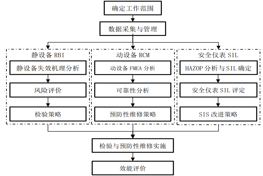 可劃分為5個(gè)主要環(huán)節并循環(huán)執行,如圖 1所示。針對靜設備RBI、動(dòng)設備RCM、安全儀表系統SIL等均有相應工作流程,如圖 2所示。
