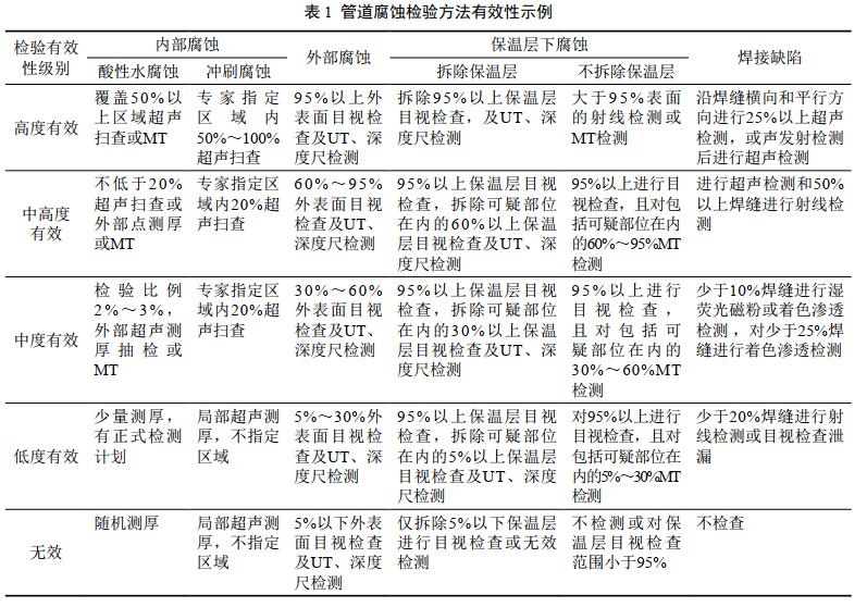 某油田站場(chǎng)靜設備主要包括承壓管道、承壓容器及常壓儲罐等,以管道腐蝕檢驗為例,其方法有效性如表 1所示。