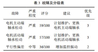本次振動(dòng)測量最大峰值為3.63 mm/s,階次約2.01x(x為轉速),位于測點(diǎn)1切向方向的高頻范圍內。其診斷結果和維修維護建議如表 3所示。