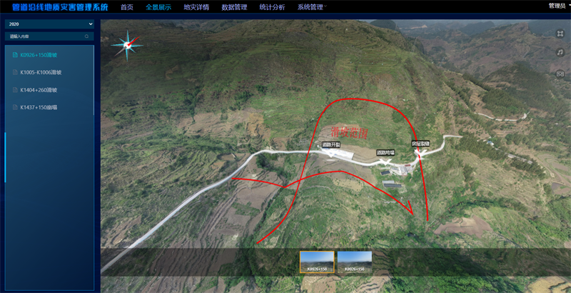 西南管道貴陽(yáng)輸油氣分公司在總結提煉管道地質(zhì)災害管理經(jīng)驗的基礎上,研發(fā)山區管道地質(zhì)災害管理信息系統,以在線(xiàn)遙感影像和服務(wù)為基礎,通過(guò)應用坐標算法轉換實(shí)現GIS空間數據(管道路由、站場(chǎng)閥室、風(fēng)險區及地質(zhì)災害點(diǎn)等)及常規數據的脫密可視化展示,并提供常規的地圖操作功能,能夠靈活瀏覽及更新地質(zhì)災害及防治相關(guān)數據。同時(shí),通過(guò)多方數據整合,實(shí)現智能統計分析,后期可結合管道數字孿生體建設,實(shí)現管道地質(zhì)災害防控的智能分析決策。