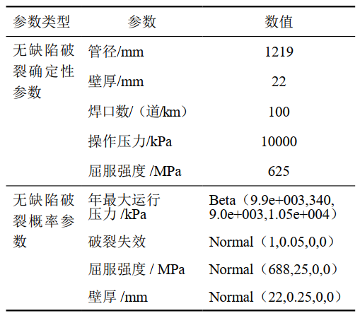 假定本管道的服役年限為30年,計算次數1000萬(wàn)次。管道投產(chǎn)后假定首次內檢測間隔時(shí)間為3年,之后內檢測周期按照每8年一次進(jìn)行,管道無(wú)缺陷破裂參數見(jiàn)表 2。采用加拿大C-FER公司開(kāi)發(fā)的PRISM軟件對該工況下的天然氣管道進(jìn)行失效概率計算。將上述不同極限狀態(tài)對應的結果分別相加,得到小泄漏、大泄漏和破裂的總失效概率見(jiàn)表 3。