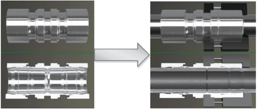 根據金屬力學(xué)特性和金屬塑性變形原理,將連接件主體與管道表面高強度壓合,實(shí)現純機械連接。首先,液壓工具推動(dòng)外套軸向向前擠壓,外套內斜面對連接件主體向內環(huán)形均勻擠壓,造成主體結構塑性變形,外套自防脫結構可以保持主體結構永久不回彈。其次,主體內部密封環(huán)均勻嵌入管體內表面,同時(shí)主體內表面也與管體表面壓接貼合,最終形成耐高壓抗振動(dòng)的高強度純金屬連接(圖 1)。