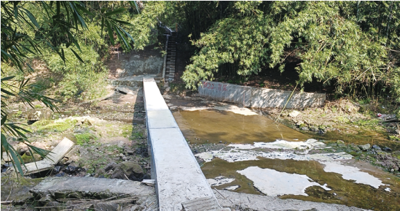 工程實(shí)例:某管道垂直等高線(xiàn)下坡后斜穿河溝,汛期河道內水量較大,沖刷力較強,兩岸擋墻基本完好,溝底暫無(wú)防護,有較多塊石堆積,粒徑 0.3 m~2.0 m。影響主要表現為河床下切、岸坡側蝕作用,因長(cháng)期水流沖刷造成露管或懸管。通過(guò)修建河道護底對穿河管道進(jìn)行保護(圖 4)。