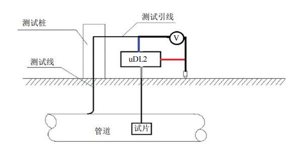 (1)電位測試。采用uDL2數據記錄儀與陰極保護試片(探頭)測試閥室管道與接地網(wǎng)(摘除前和摘除后)通電電位、交流電壓、試片瞬間斷電電位變化等。將管道、試片、參比電極對應接入uDL2,其自動(dòng)一次性采集通電電位、斷電電位、交流電壓和交流電流密度(圖 1)。