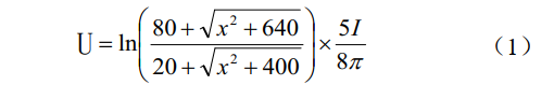參比電極受到干擾將造成陰保數據收集不準確,恒電位儀輸出不穩定最終造成陰極保護系統失效。受周邊復雜空間電場(chǎng)影響,參比電極存在明顯的直流干擾。采用由遠及近,再由近至遠的方式測量并行管道參比電極測點(diǎn)處電壓偏移值并進(jìn)行定量分析,結果如圖 2所示。建立空間電場(chǎng)變化對參比電極干擾模型如圖 3所示。