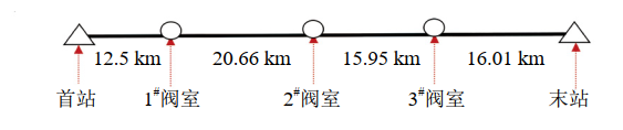 (2)對相關(guān)問(wèn)題的處置措施。圖 2為站場(chǎng)及閥室相對距離圖。當檢測器首次停留在3#閥室前7 km處時(shí),2#閥室和3#閥室之間壓差始終在0.25 MPa左右,若在密封完好的情況下,檢測器可正常行進(jìn),但檢測器因自身重量較重,且皮碗破損已較為嚴重,存在泄流現象,需工藝調整建立更大的壓差方可推動(dòng)檢測器正常行進(jìn)。決定開(kāi)通3#閥室放空閥,通過(guò)放空牽引方式給檢測器建立新動(dòng)力,同時(shí)通過(guò)放空引流可以抽走檢測器前段的粉塵雜質(zhì)。處置后檢測器順利前行5 km,又停留在3#閥室前2 km處。