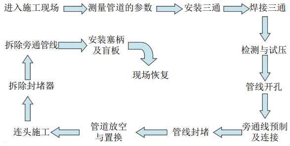 在役管道不停輸狀態(tài)下的施工通常采用封堵技術(shù)與設備,先將改造段兩端分別用旁通管線(xiàn)接通輸送介質(zhì),然后封堵主管線(xiàn),清空隔離段介質(zhì),以進(jìn)行主管線(xiàn)施工作業(yè)。待新管段恢復后,解除封堵,切換至新管段正常輸送,最后將旁通管線(xiàn)拆除,F場(chǎng)管件機械密封、恢復。其施工工藝及施工流程分別如圖 1、圖 2所示。不停輸施工主要執行標準GB/T 28055―2011《鋼制管道帶壓封堵技術(shù)規范》、GB/T 31032―2014《鋼制管道焊接及驗收》、SY/T 6150―2017《鋼制管道封堵技術(shù)規范 第1部分 塞式、筒式封堵》等。
