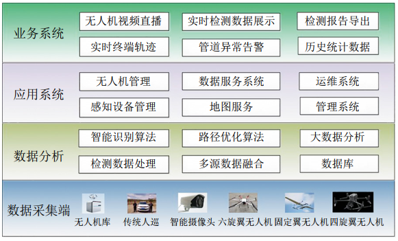 如圖 3所示,巡檢系統主要由數據采集端、數據分析層、應用系統、業(yè)務(wù)系統組成,可以遠程管控機庫進(jìn)行常態(tài)化管道巡檢和應急響應等場(chǎng)景應用。