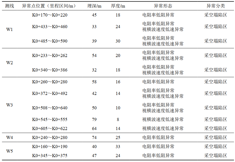 (2)通過(guò)高密度電法和微動(dòng)面波勘探結果可知,整個(gè)工區存在13處物探異常點(diǎn),推測大部分采空區厚度為8 m~24 m,考慮石膏礦局部地下水軟化坍塌等情況,結論與勘察報告資料分析的膏層厚度為10.8 m~14.9 m基本吻合。