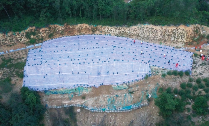 (1)設置導排水。沿管道順氣流左側即靠近山脊側開(kāi)挖排水溝渠排水,整個(gè)橫坡坡面苫蓋彩條布,降低連續雨水對坡面的影響(圖 1)。