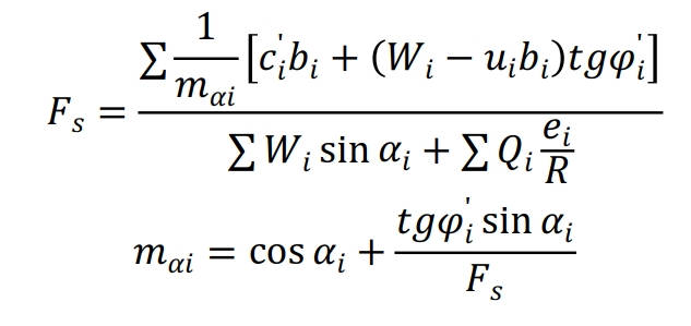 式中:FS為安全系數;mαi為第i個(gè)條塊的計算系數;αi 為第i個(gè)條塊底部的傾角;Wi為第i個(gè)條塊的重量;Ci為第i個(gè)條塊的粘聚力;bi為第i個(gè)條塊的長(cháng)度;ui為第i個(gè)條塊的孔隙水壓力;φ’i 為第i個(gè)條塊的有效內摩擦角;Qi為第i個(gè)條塊所受的水平向作用力;ei為第i個(gè)條塊所受的法向條間力;R為滑面半徑。