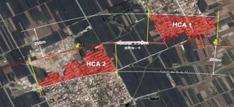 在高后果區識別過(guò)程中,為降低難度,從構建筑兩側端點(diǎn)位置向管道做垂線(xiàn),兩條垂線(xiàn)各向外延長(cháng)200 m的距離就是此段高后果區,如圖 2中實(shí)際劃分,此方法簡(jiǎn)單可行,識別效率高,準確度高。