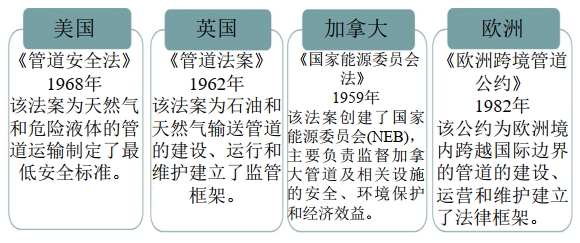 油氣管道業(yè)發(fā)達國家均十分重視油氣管道安全的立法,美國、加拿大、歐盟及英國等發(fā)達國家及組織先后對油氣管道行業(yè)開(kāi)展立法工作(圖 1)。