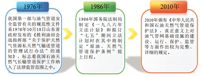 隨著(zhù)油氣管道的大規模建設,管道保護任務(wù)日趨繁重。安全法律法規體系也在逐步完善,初步形成以法律、行政法規、部門(mén)規章為主導,規范性文件為支撐,內容涵蓋安全生產(chǎn)、管道保護、應急處置、環(huán)境保護以及職業(yè)健康等領(lǐng)域的油氣管道安全法律法規體系框架。目前,我國油氣管道安全監管的法律監管框架呈現出由一部綱領(lǐng)性法律統領(lǐng),由一定數量的國務(wù)院及其各部委頒布的行政法規、部門(mén)規章、政府文件等規范性法律文件主導監管,由各地方政府頒布的規定、文件作為主力監管,由司法解釋及其它規定作為補充監管的格局。我國油氣管道代表性法律及立法歷程如圖 2所示。