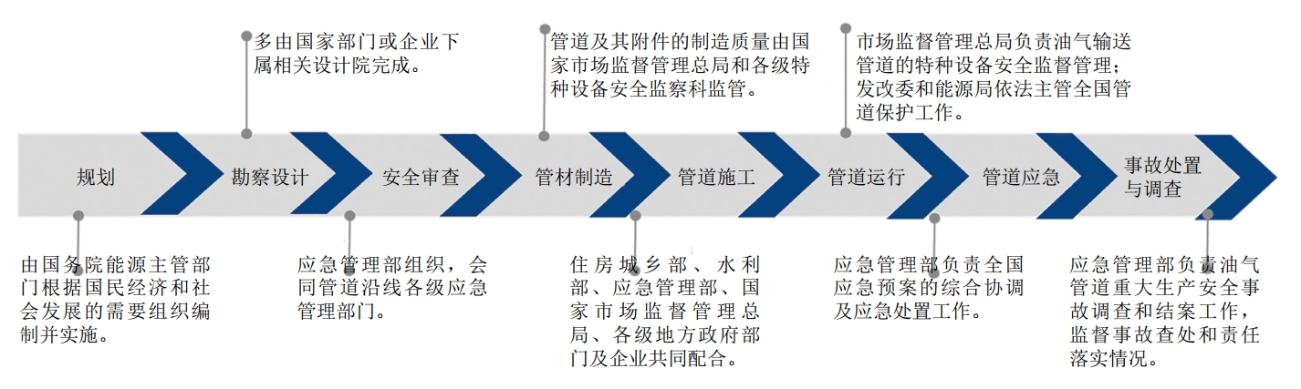 除上述法律外,國務(wù)院頒發(fā)了《特種設備安全監察條例》《危險化學(xué)品安全管理條例》《安全生產(chǎn)事故報告和調查處理條例》《建筑工程安全管理條例》等行政法規,其中部分條款對油氣儲運安全做了進(jìn)一步的規定。安全監管部門(mén)和地方政府還制定了部門(mén)規章和地方條例,如應急管理部(原安全生產(chǎn)監督管理總局)頒發(fā)的《壓力管道安全管理與監察規定》《安全生產(chǎn)事故應急預案管理辦法》,浙江、天津、山東、貴州等省市頒布了《石油天然氣管道保護條例》等。同時(shí),為解決管道保護面臨的新問(wèn)題,國家能源主管部門(mén)等出臺了《油氣輸送管道與鐵路交匯工程技術(shù)及管理規定》《關(guān)于規范公路橋梁與石油天然氣管道交叉工程管理的通知》《關(guān)于貫徹落實(shí)國務(wù)院安委會(huì )工作要求全面推行油氣輸送管道完整性管理的通知》等。