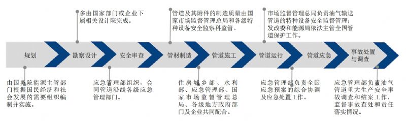 全生命周期的監管體系。管道的全生命周期包括了管道規劃設計、公共聽(tīng)證、管道勘察設計、管材制造、管道施工、管道運行、管道檢測、管道報廢、應急響應、事故調查和廢棄,如圖 3所示。同時(shí)管道的全生命周期開(kāi)展預評價(jià)、安全評價(jià)、環(huán)保評價(jià)、驗收評價(jià)、適應性評價(jià)等。