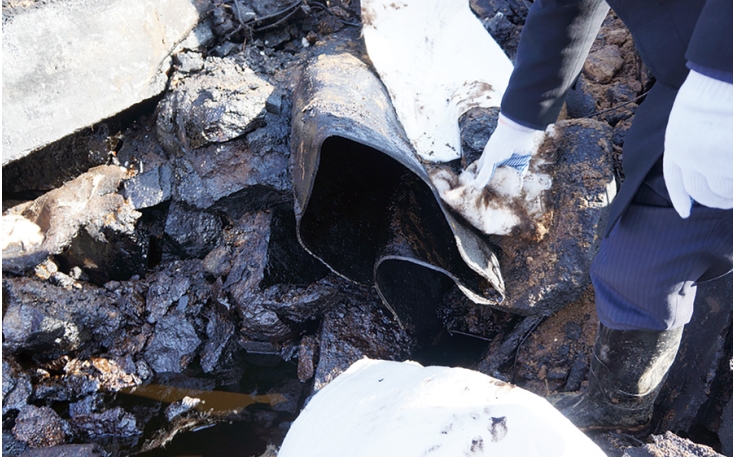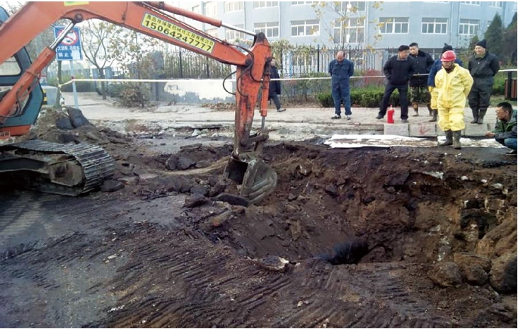 事故發(fā)生時(shí)秦皇島路正在進(jìn)行全面的翻修改造,據施工方介紹此次改造將原路面下挖半米,再重新做路基、鋪瀝青。在道路翻修過(guò)程中,施工方和管道業(yè)主方均未考慮地下管道的保護問(wèn)題。從現場(chǎng)看,路面下挖工作已經(jīng)完成,在搶修作業(yè)照片(圖 5)中可見(jiàn),管道直接埋在地下,大量泄漏的原油滲入土壤。管道上方覆土厚度約為0.7 m,路面開(kāi)挖、渣土運輸對管道的碾壓和沖擊不可避免。