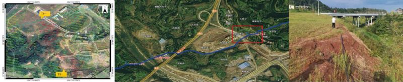 圖 3 K093+725區段InSAR結果、光學(xué)影像及現場(chǎng)調查圖