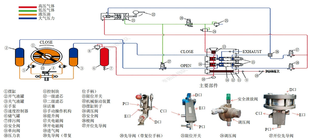 10726-s型Shafer氣液聯(lián)動(dòng)執行機構主要由擺缸、氣液罐、儲氣罐、手泵、提升閥、復位先導閥、開(kāi)電磁閥、關(guān)電磁閥、限位開(kāi)關(guān)、機械驅動(dòng)裝置、調壓閥、安全閥、鎖閥等組成(如圖 1)。