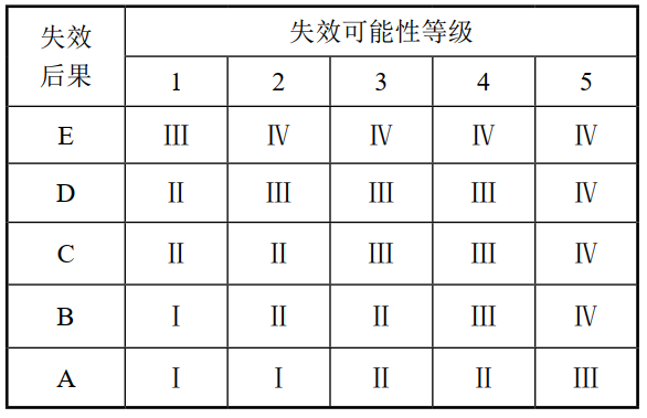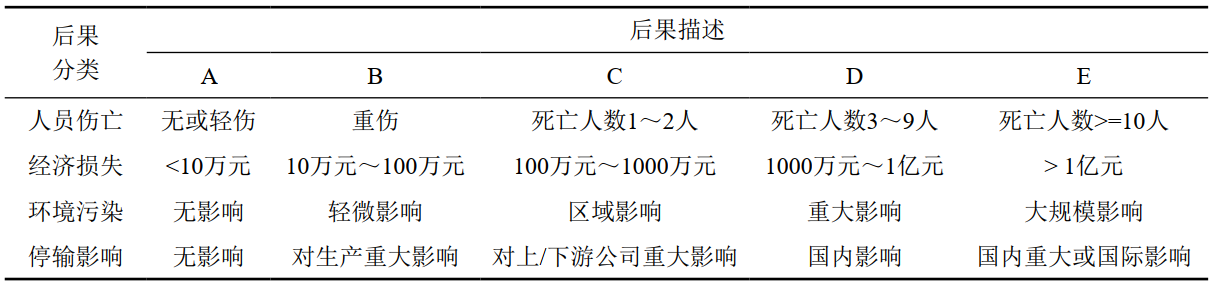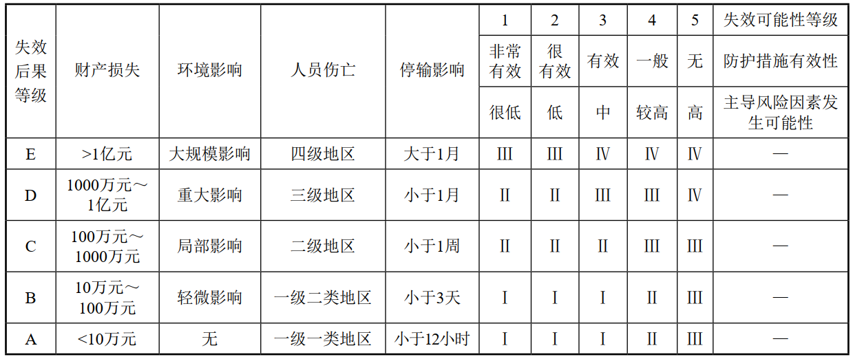 改進(jìn)要點(diǎn)包括:①采用地區等級劃分替代失效后果中人員傷亡人數的分級方法;②失效可能性分級中,增加了防護措施有效性等級劃分,如果風(fēng)險點(diǎn)采取了針對性的防護措施,最終的失效可能性分級以主導風(fēng)險因素發(fā)生可能性、防護措施有效性確定的等級中較高者為最終失效可能性等級;③失效可能性分級中,明確指出應以主導風(fēng)險因素來(lái)劃分等級。