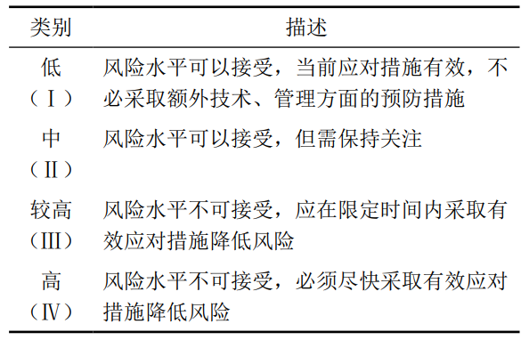 GB 32167附錄E,給出了典型的風(fēng)險矩陣和評價(jià)等級,如表 1、表 2、表 3所示。