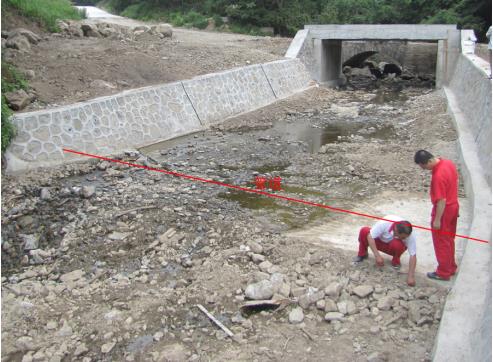 B穿越河流處,曾采用護岸墻+漿砌石過(guò)水路面形式防護,這次也因暴雨形成的水石流造成過(guò)水路面沖毀、左岸護岸墻前緣掏蝕嚴重及右岸護岸墻損毀殆盡(圖 3)。