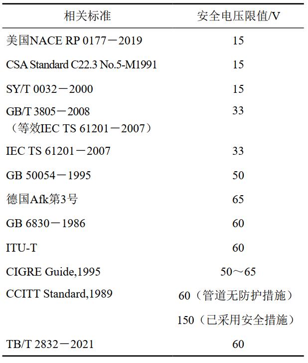 (3)輸電線(xiàn)路故障狀態(tài)下的安全限值。目前國內最常用的管道防腐層材料為3層PE和FBE(熔結環(huán)氧粉末)。根據國內試驗結果,這兩種防腐層材料的瞬時(shí)安全電壓限值一般都能達到幾十千伏,遠遠高于管道防腐層上可能出現的最大涂層電壓。因此,以短時(shí)人體安全電壓限值作為判定交流輸電線(xiàn)路與管道安全距離的標準,也是一種常用選擇。短時(shí)作用下的人體瞬間安全電壓有關(guān)標準如表 2所示。GB 6830―1986采用了CCITT的推薦值。但根據世界各國現場(chǎng)運行經(jīng)驗,CCITT的推薦值偏于保守。正是出于這種認識,ITU-T(國際電信聯(lián)盟)建議對高可靠輸電線(xiàn)路的感應電壓允許值按故障切除時(shí)間分等級,故障切除時(shí)間越短,危險影響標準越高,如表 2中所示限值。據此,我國在DL/T 5033―2006《輸電線(xiàn)路對電信線(xiàn)路危險和干擾影響防護設計規程》中采用了這一建議。