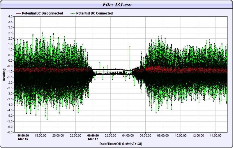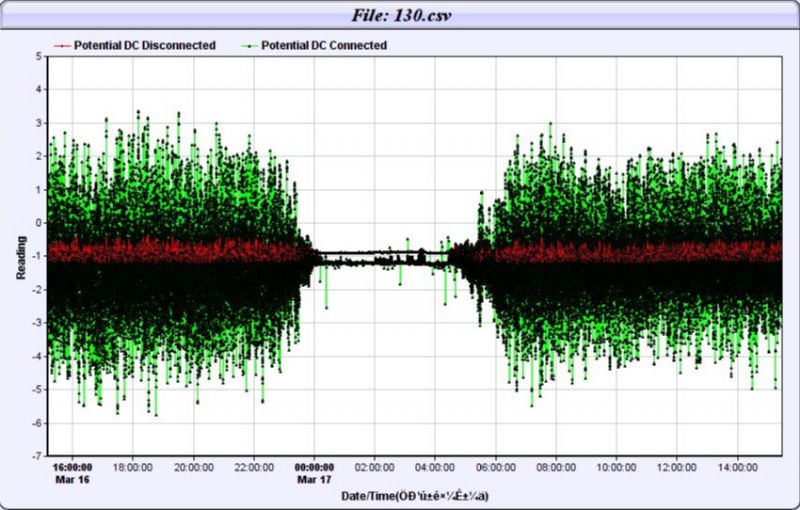 測試同時(shí)表明,130#樁波動(dòng)范圍﹣5.74 V至﹢3.11 V、131#樁波動(dòng)范圍﹣5.42 V至﹢2.644 V、132#樁波動(dòng)范圍﹣4.87 V至﹢2.371 V。其中130樁波動(dòng)最劇烈,波動(dòng)幅度為8.85 V,131#樁次之,132#樁相對波動(dòng)最小,離干擾源越近干擾程度越大。