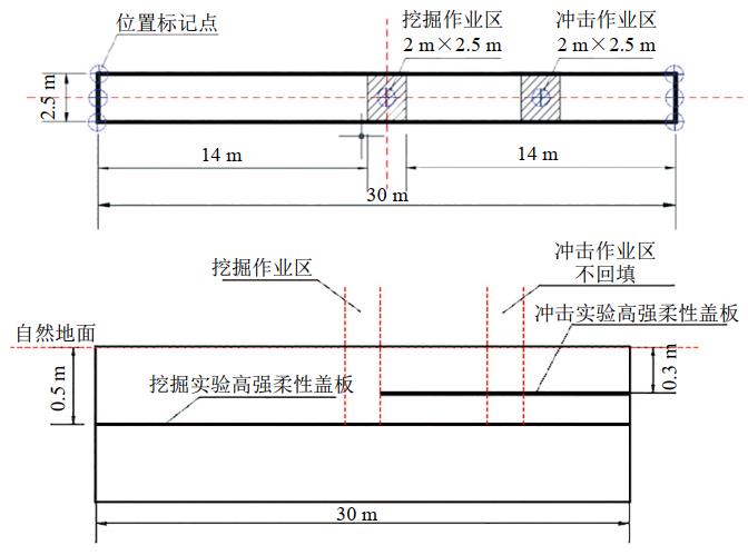 (2)警示和機械防護效果試驗。本次試驗將高強柔性蓋板埋深在地面0.5 m處,試驗段土工格柵尺寸長(cháng)為30 m、寬為2.5 m,埋深深度0.5 m,沖擊作業(yè)區位置設置在中間部位,尺寸長(cháng)為2 m、寬為2.5 m,整段區域全部進(jìn)行土體回填,通過(guò)長(cháng)度方向上的土體來(lái)抵抗挖機的一部分拖拽力,避免高強柔性蓋板被挖掘機鏟斗拖拽出。為了全面測試高強柔性蓋板的性能,設置縱向挖掘格柵的頂部和邊緣、縱向挖掘格柵中心的頂部和橫向挖掘蓋板的頂部和邊緣、橫向挖掘格柵中心的頂部等四種測試。
