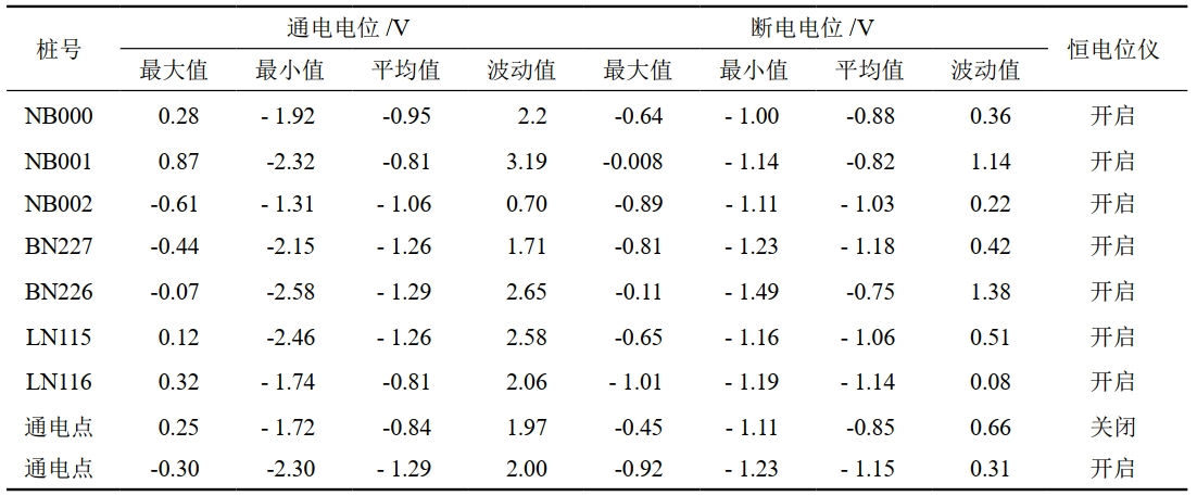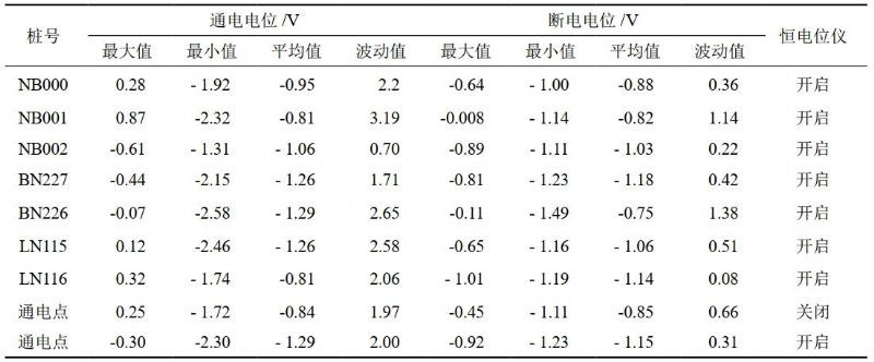 (3)選擇本測試管段最近的測試樁進(jìn)行管地電位監測,并提取檢測數據進(jìn)行分析,對所有檢測的測試樁數據分別提取出干擾電壓最大值、最小值、平均值。