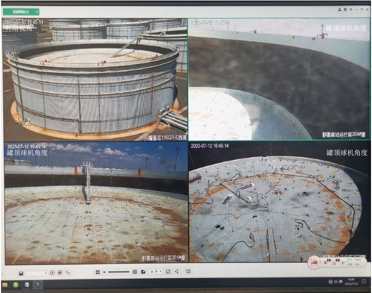 罐頂防爆高清一體化球機投用后,通過(guò)鏡頭旋轉,可對儲油罐浮頂進(jìn)行無(wú)死角監控,監控圖像清晰,操作靈敏(圖 2)。項目投運也夯實(shí)了工業(yè)電視監控系統與火災自動(dòng)報警系統聯(lián)動(dòng)的基礎,當報警發(fā)生時(shí),能自動(dòng)聯(lián)動(dòng)控制相關(guān)的攝像機轉向報警區域,使站控調度工作人員第一時(shí)間掌握現場(chǎng)實(shí)際情況,確保第一時(shí)間發(fā)現安全隱患并處理。