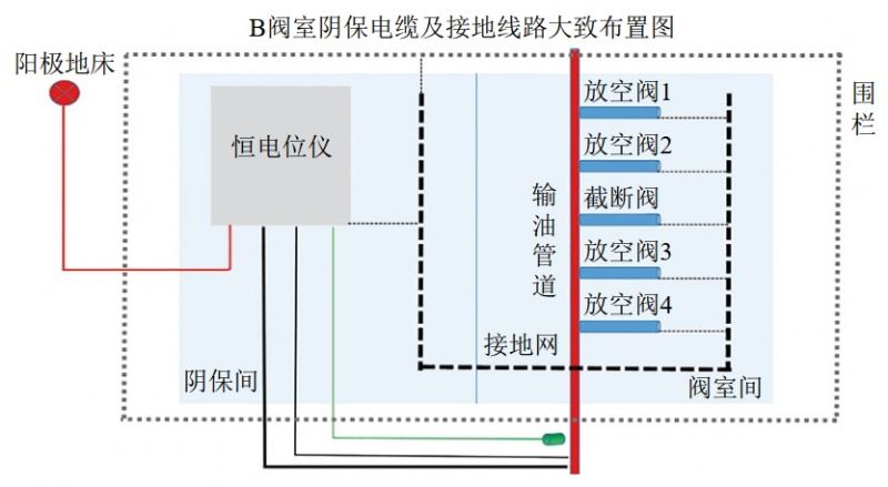 (4)搭接點(diǎn)查找。查閱設計及竣工圖紙,并根據實(shí)際情況繪制出B閥室陰保電纜及接地線(xiàn)路大致布置圖(圖 1)。