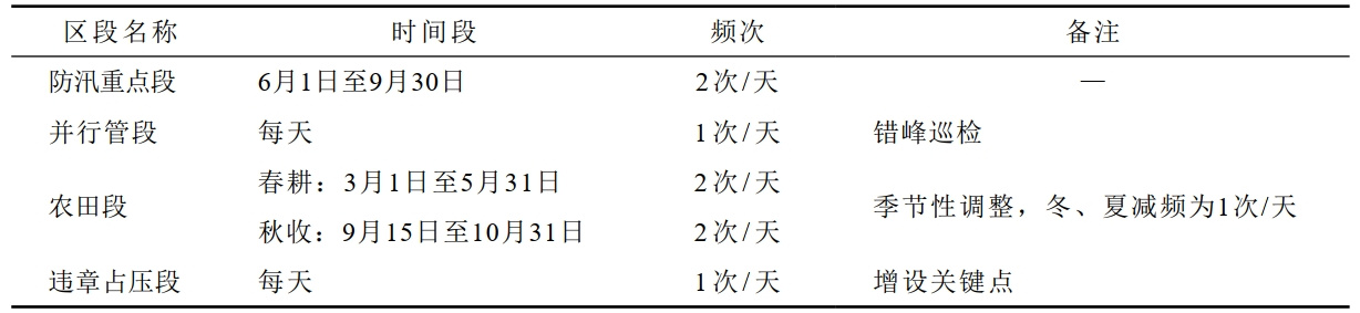 對于受外界或季節性干擾相對較大的特殊區段,包括但不限于違章占壓段、防汛重點(diǎn)段、管道并行段,例如管道途徑農田地,在春耕和秋收季節,可采取增加巡護頻次的方法控制風(fēng)險;夏季和冬季可減頻巡檢,此種情況具有相對靈活的特征(表 2)。