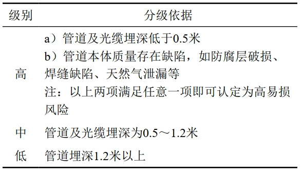 (3)管道易損性定性分級。根據數值模擬結論可知,山火對正常埋深且本體不存在質(zhì)量問(wèn)題的管道、光纜基本沒(méi)有影響,山火對途經(jīng)管道的影響主要來(lái)源于埋深及管道自身缺陷兩個(gè)方面,以此對管道易損性分為三級(表 2)。