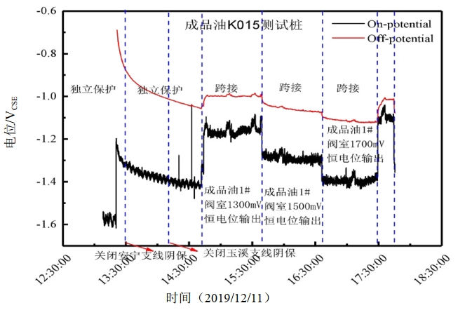 可以看出,跨接前后測試樁通斷電電位變化顯著(zhù)。相比C站干線(xiàn)陰極保護系統上下游多套陰極保護系統相互影響,B原油支線(xiàn)和F天然氣支線(xiàn)陰極保護系統較為單一,跨接試驗前后已將其關(guān)閉,因此跨接后B原油支線(xiàn)、F天然氣支線(xiàn)和成品油干線(xiàn)電位變化顯著(zhù)。當1#成品油閥室恒電位輸出1300 mV時(shí),K016測試樁處B原油支線(xiàn)、F天然氣支線(xiàn)和成品油干線(xiàn)電位均能滿(mǎn)足標準要求,其有效保護范圍約3 km,并且管道沿線(xiàn)K019和K022測試樁處仍然有一定保護效果,但其管道斷電電位已經(jīng)不滿(mǎn)足標準﹣850 mV準則。繼續增大1#成品油閥室輸出至1500 mV和1700 mV,靠近跨接點(diǎn)的B原油支線(xiàn)、F天然氣支線(xiàn)和成品油干線(xiàn)K015和K016測試樁處陰極保護效果有部分提升,但遠離跨接點(diǎn)的K019和K022測試樁保護效果無(wú)明顯提升。其結果說(shuō)明跨接能有效提升原本陰極保護水平較差的F天然氣支線(xiàn)的陰極保護效果,但是單靠單點(diǎn)的跨接作用的范圍較為有限,無(wú)法使管道沿線(xiàn)電位均達到標準要求。