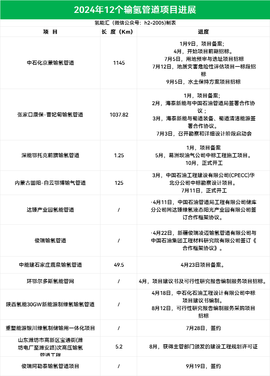 除此以外,2024年還有12個(gè)輸氫管道項目取得進(jìn)展,就公開(kāi)數據顯示,這些項目建成后,我國將擁有長(cháng)達2363.77km輸氫管道。